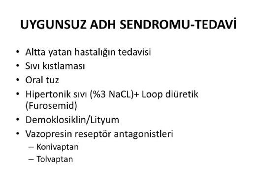 Bu testler, ADH seviyelerinin değerlendirilmesine ve sendromun nedeninin belirlenmesine yardımcı olur. Uygunsuz ADH Sendromunun Tedavisi Tedavi, sendromun altında yatan nedenin belirlenmesine ve tedavi edilmesine dayanır. Genel tedavi yaklaşımları şunlardır: